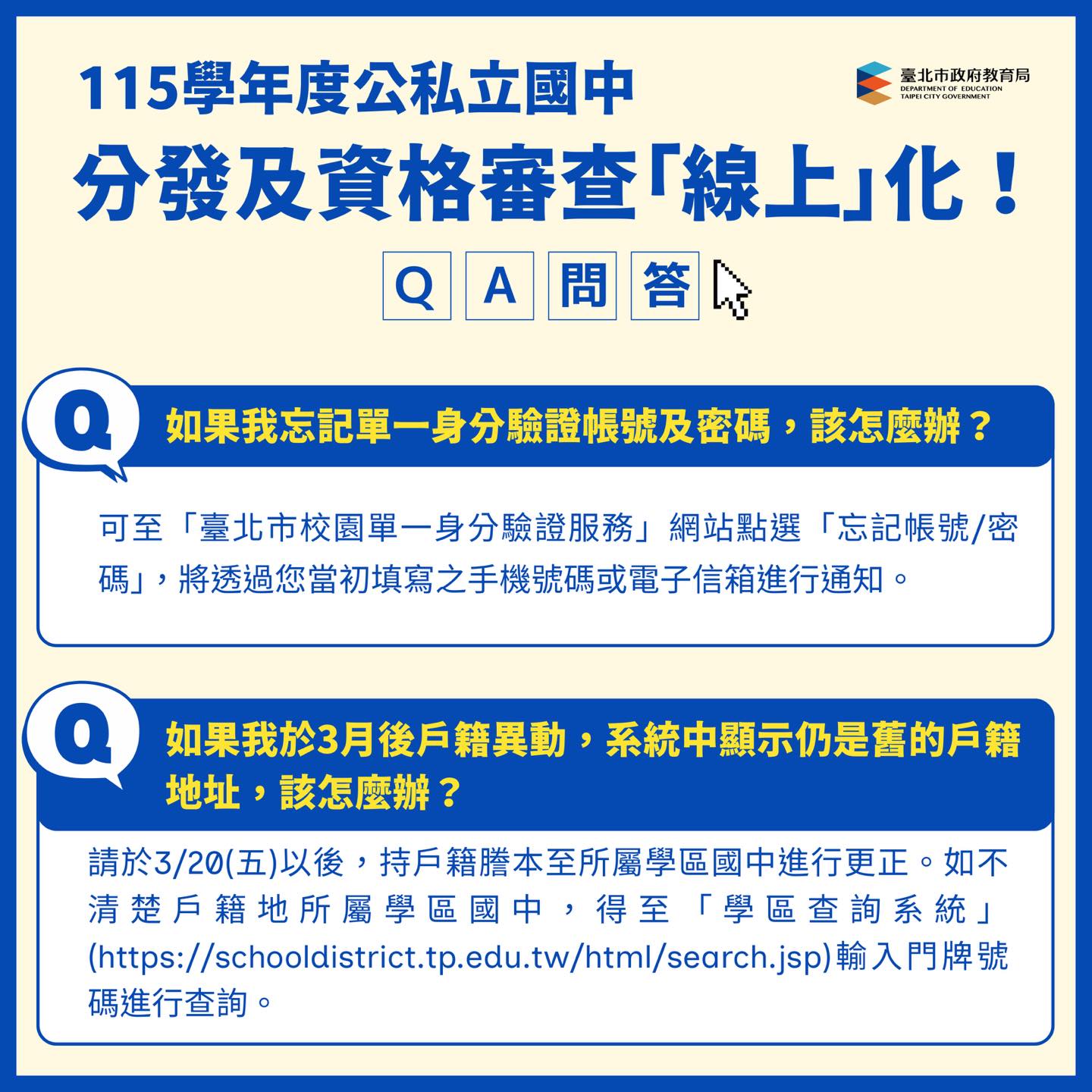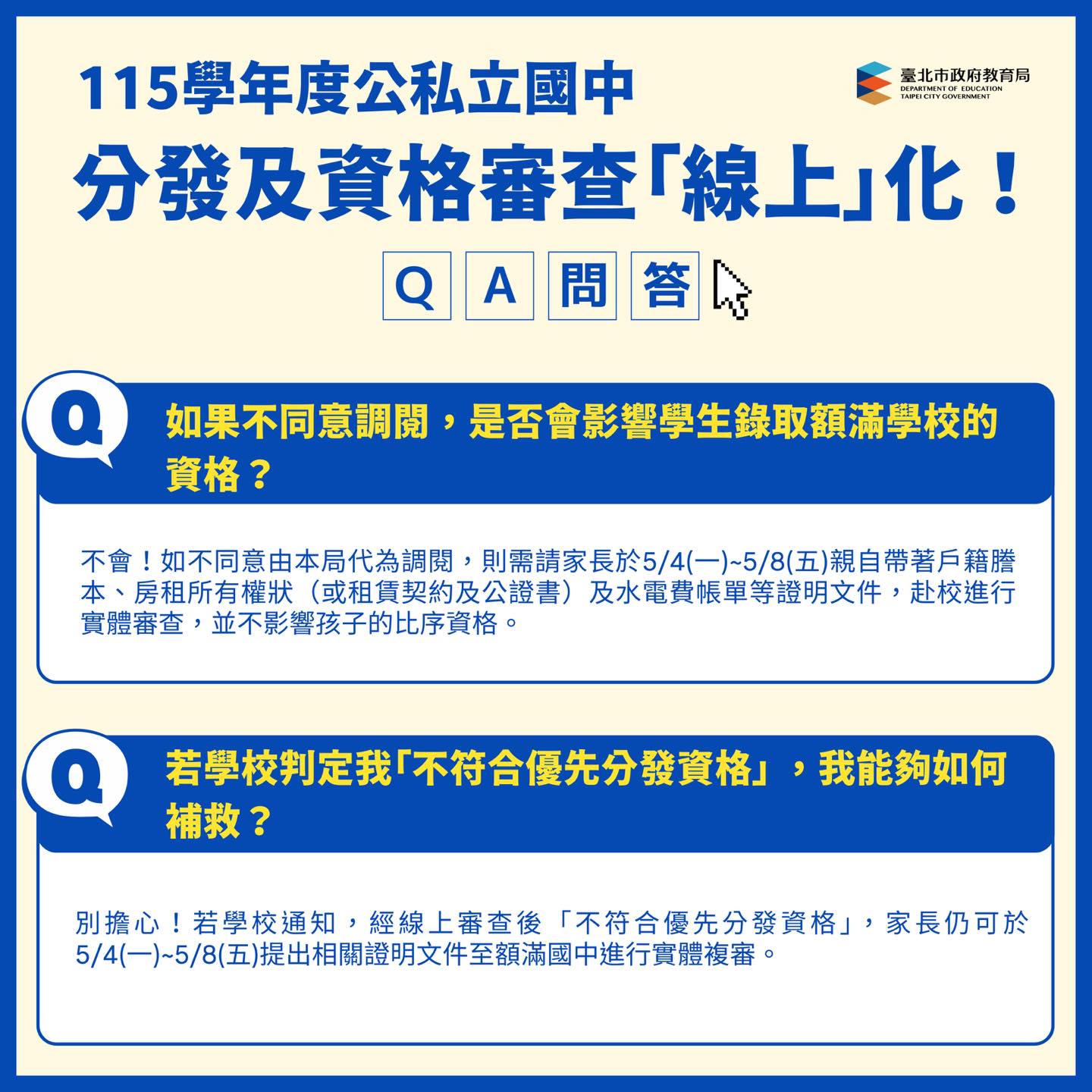 「115學年度臺北市公立國中分發及資格審查」全面線上化!透過👉「新生分發入學作業平臺」,從分發登錄、資格審查到後續報到,皆可採線上方式辦理,在家即可完成重要入學程序,省時又便利✨