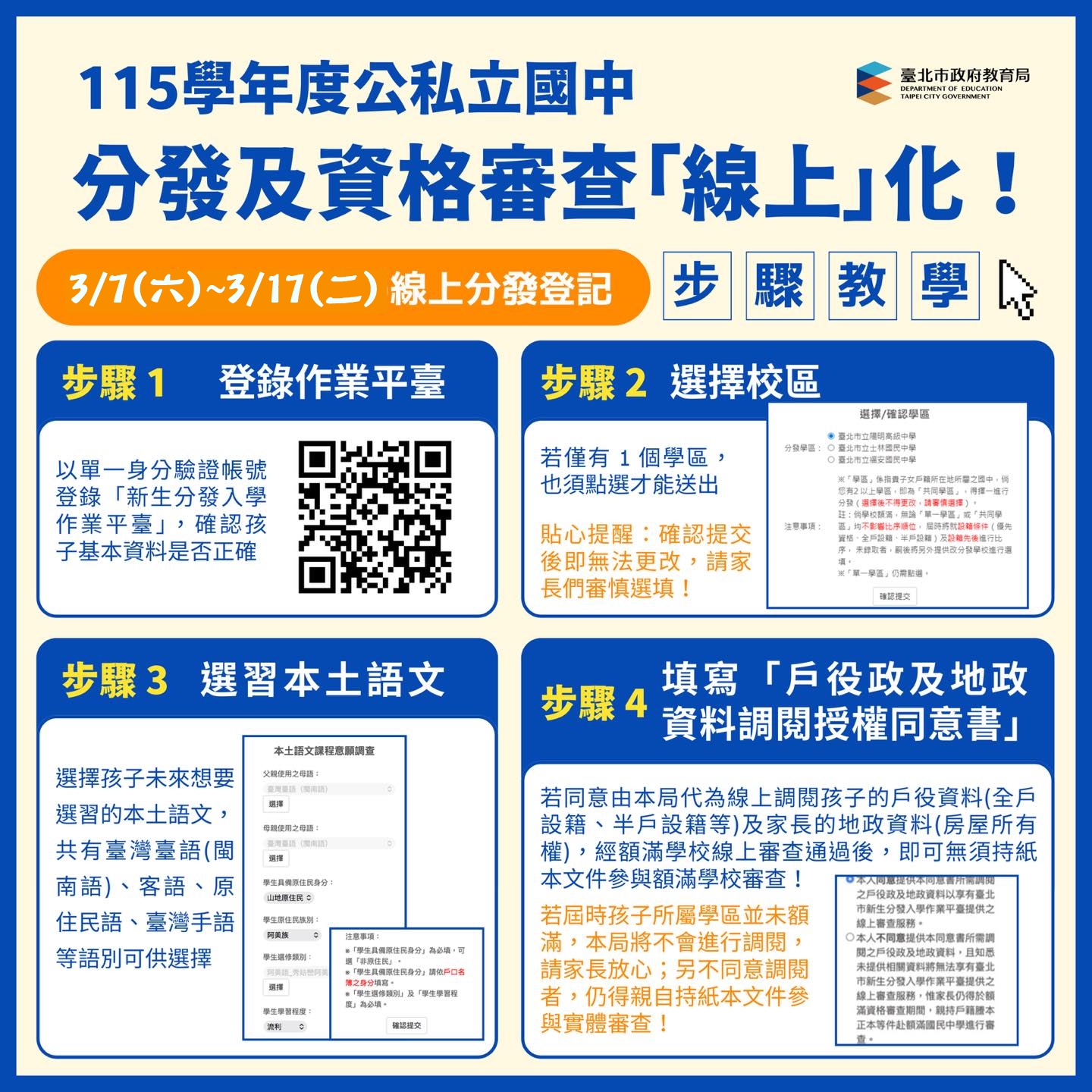 須於規定期間登入👉「新生分發入學作業平臺」,完成1.學區選擇、2.本土語文選習及3.資料授權,授權後由教育局協助調閱戶役政及地政資料,符合資格者可免到校進行實體審查。