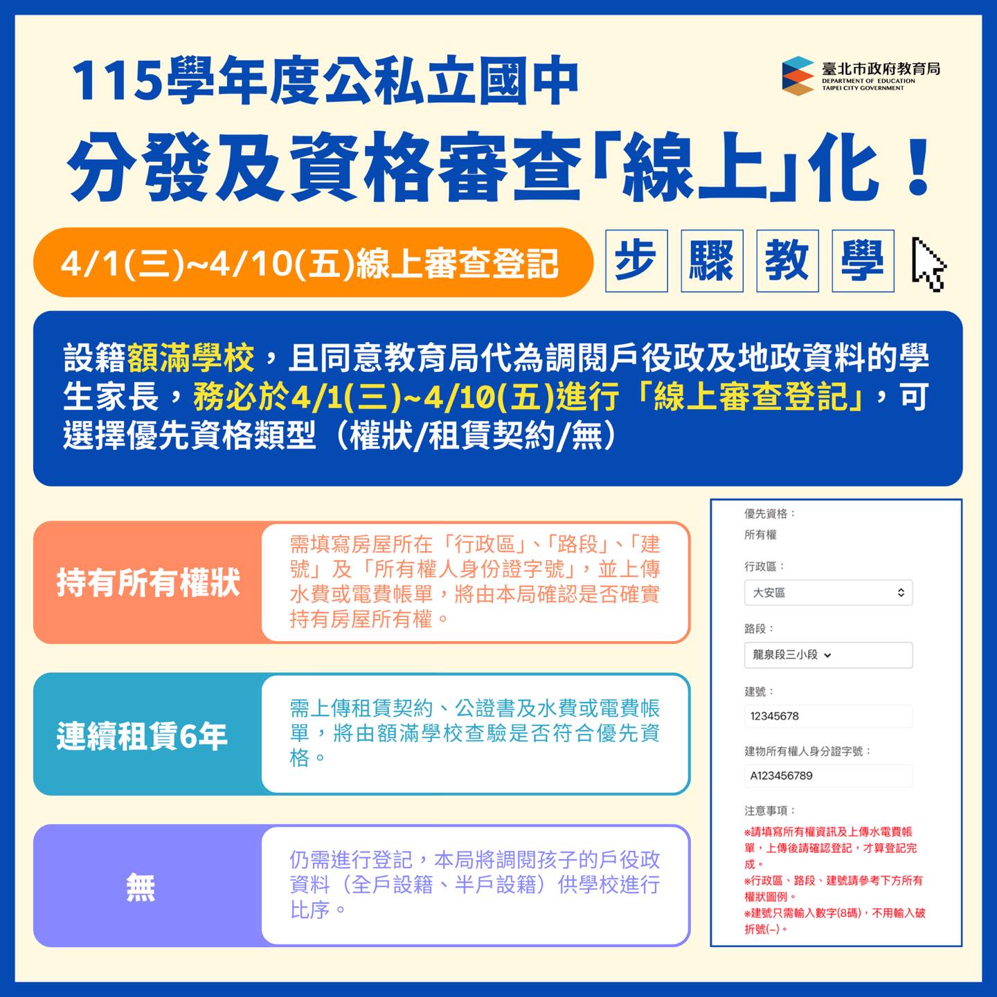 設籍額滿學校者須登錄系統進行優先資格登記,包含房屋所有權或連續租賃6年以上等資格審查;若未符合優先資格,也可依設籍情形進行比序,保障學生入學權益!