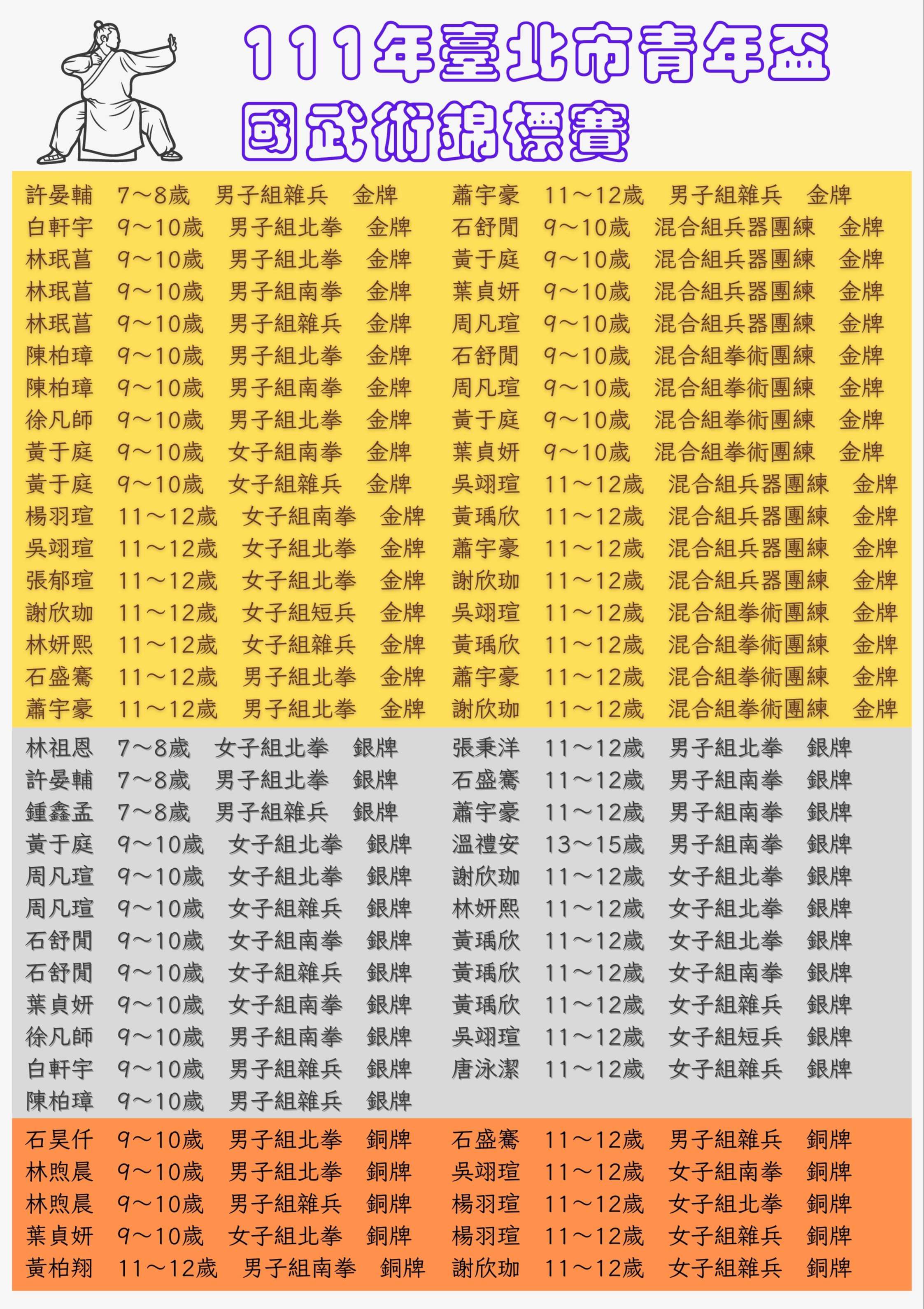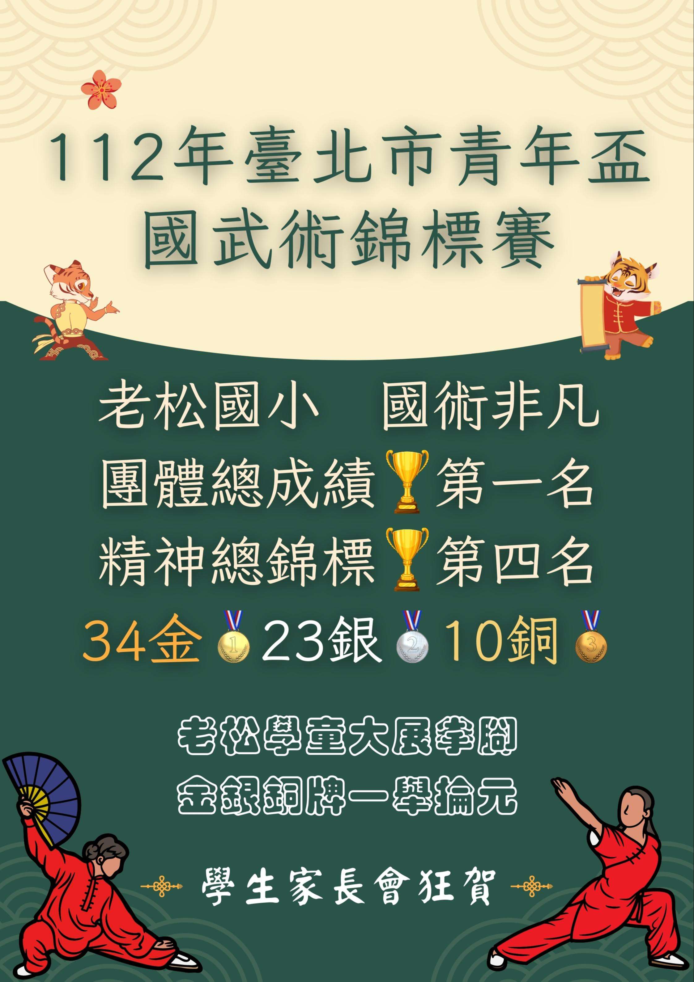 本校國術隊參加112年臺北市青年盃國武術錦標賽,榮獲獲34金、23銀、10銅獎及團體總成績第一名、精神總錦標第四名。