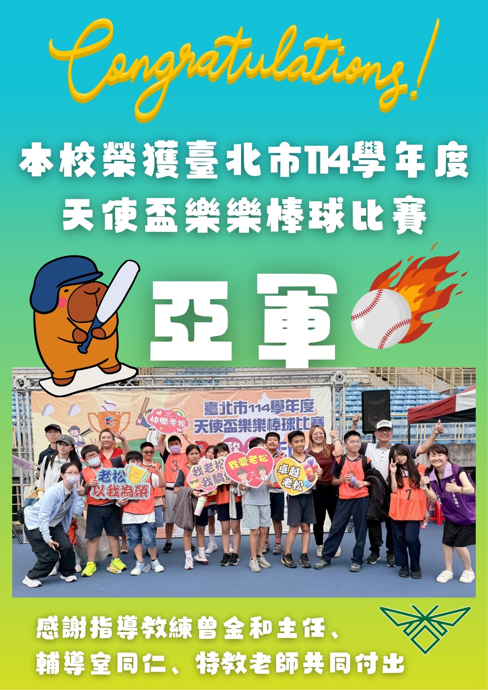 本校榮獲臺北市114年度天使盃樂樂棒球比賽亞軍!!
