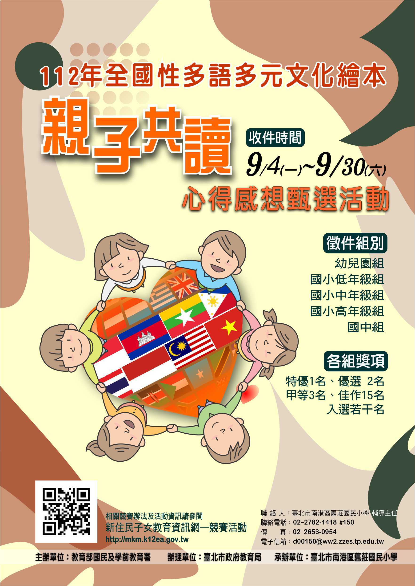 一、112年度全國性多語多元文化繪本親子共讀心得感想甄選活動 收件時間自112年9月4日至9月30日止。