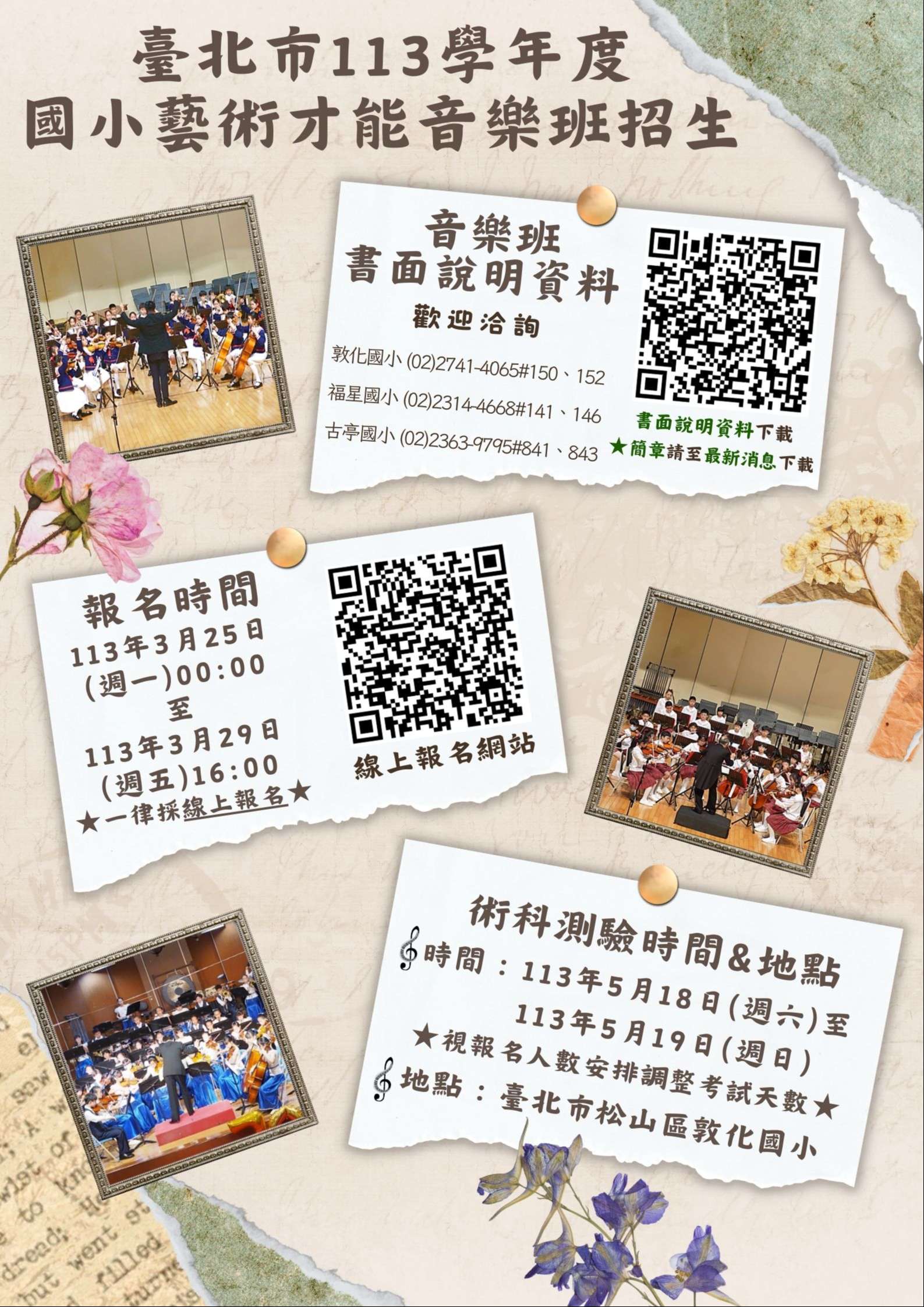二、報名時間及方式:113年3月25日(星期一)00:00起至3月29日(星期五)16:00止,於本市國中小藝才班鑑定報名系統(https://tparttalent.tp.edu.tw)報名。