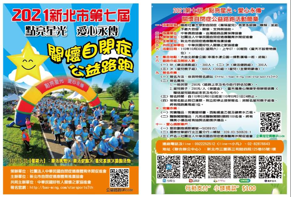 2、星兒親子: 390元/人〈保證金〉,當天攜身心障礙手冊現場辦理退費〈贈送星兒路跑記念衣及毛巾〉。