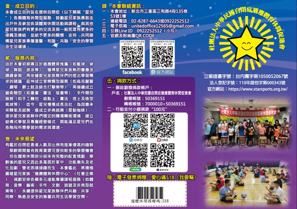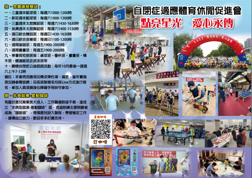 一、該會長期致力於自閉症者〈以下簡稱“星兒”〉各項體育〈籃球、桌球、水適能、舞蹈等〉及休閒〈藝術創作、音樂培養、手作工藝等〉等服務,期能提供星兒家庭專屬合適的學習環境,不斷成長〈簡介單張如附件〉。