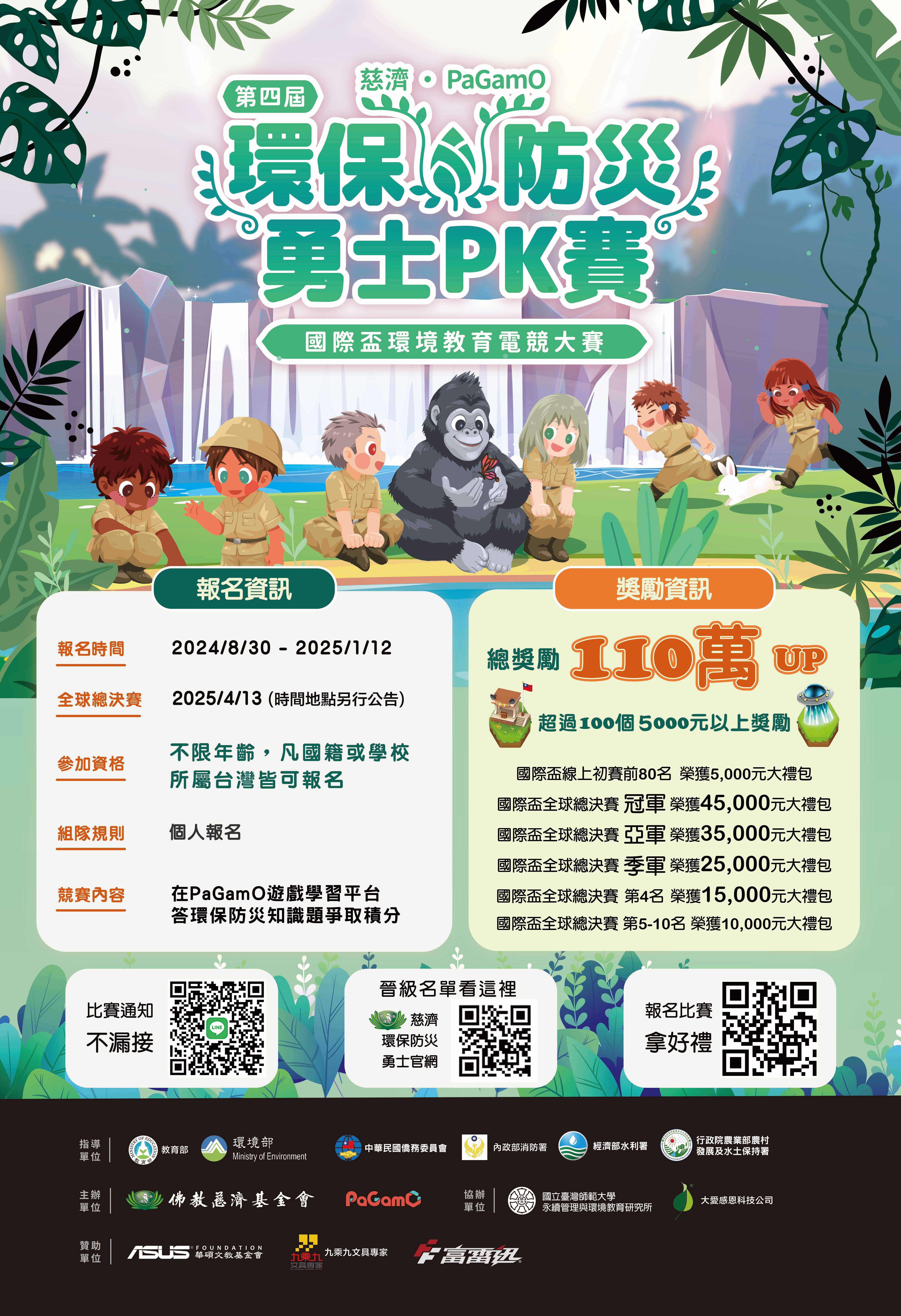 檢送第四屆「慈濟xPaGamO【臺北市】縣市盃環保防災勇 士PK賽」活動簡章、環保防災電競DM、國際盃海報各1 份