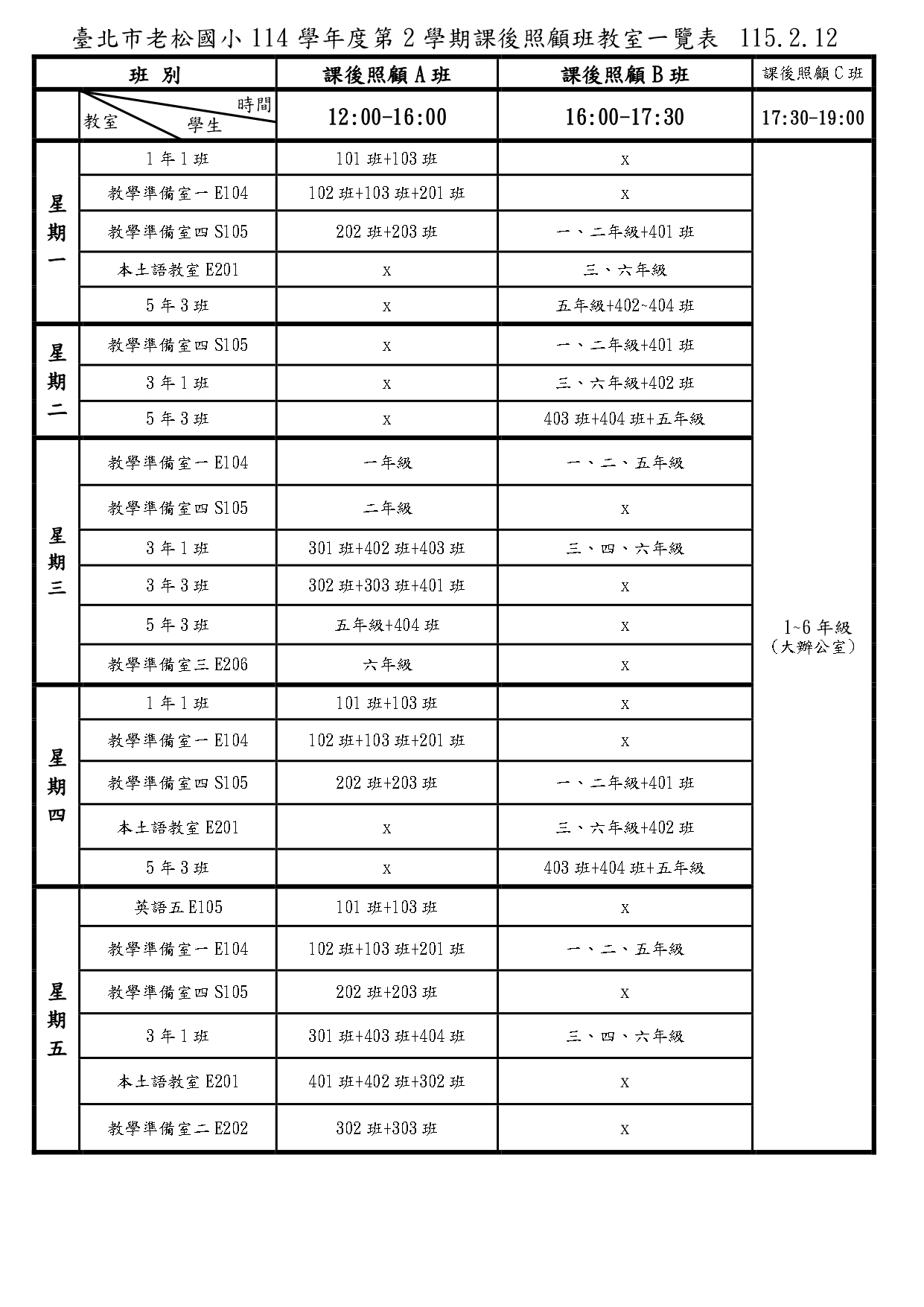 2.114學年度第二學各班級教室位置分配表詳參下圖